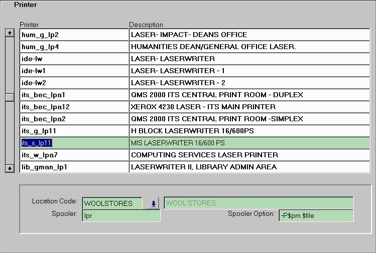 It is expected that the data in this form will be set up and maintained by information technology staff. The form is used to record and maintain a list of those printers on the institution's network which should be available to the Job Control and Scheduling facility. These printers may be chosen as a destination for reports and other printed output from jobs run within the system. |