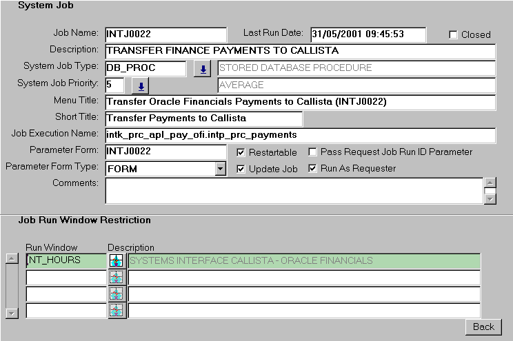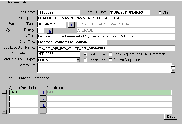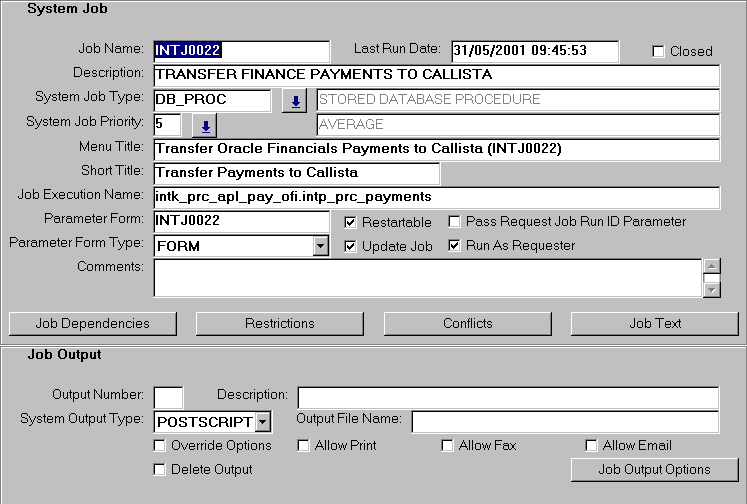 An executable job (recorded here in the Job Execution Name field) can be known within the Callista system under several different job names, each of which may be associated with one or more output records. In this block it is also possible to indicate that restrictions apply on the data accessed for report jobs. The nature of the data restrictions depends on the database access specified in the security subsystem for the person requesting the job. Overlay blocks called from this block are used to record restrictions about time and method of running. A form can also be called to record any prerequisite and/or dependent jobs associated with this job. Details of output file(s) from the job are recorded in the Job Output block. |