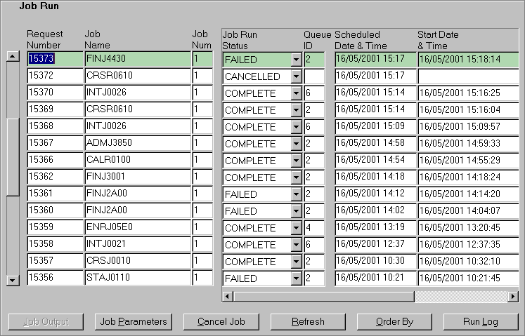 is carried forward. The form also allows review of the outcome of recent job runs, using query mode. Query criteria can be entered in any field to refine the inquiry, and the list of jobs can be re-ordered using the Order By pop-up window. A spread table allows access to the fields at the far right. It is also possible to use this form to cancel individual jobs that have not yet started running. Information