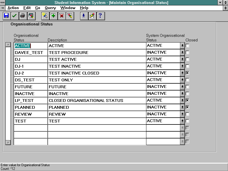 - An organisational status can be closed, preventing any further use, by selecting the Closed check box.