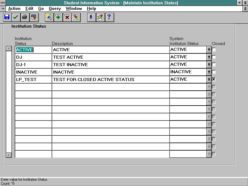 - If an institution status has been used in the definition of an institution, it cannot be deleted. It can be closed, preventing any further use, by selecting the Closed check box.