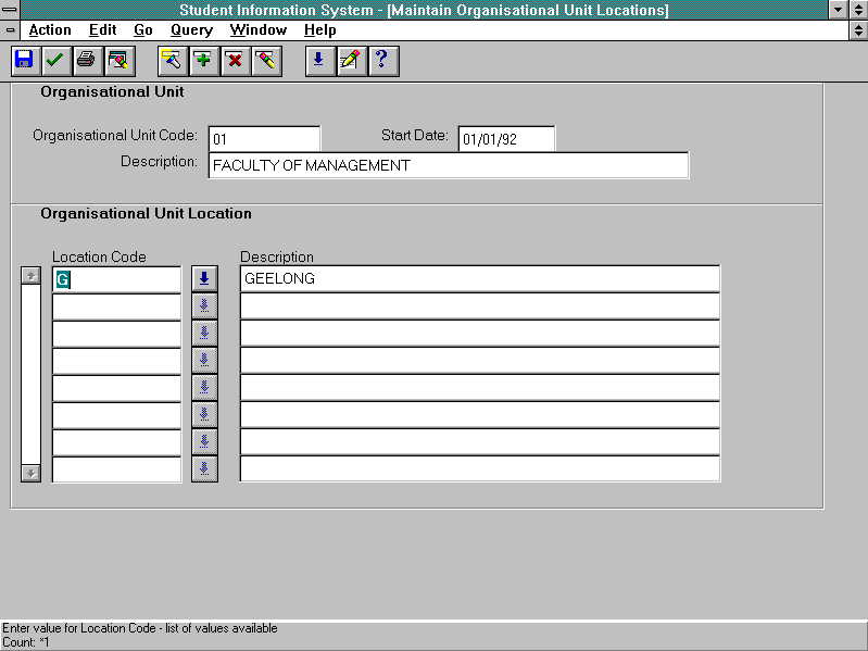 This context block displays the organisational unit for which locations are given in the Organisational Unit Location block beneath. If the form is entered via the navigation button in the Maintain Organisational Units form, this block displays the record in use in that form. |