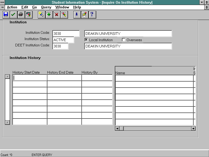 This form has been replaced by the Inquire on Institution History form (AUDF3141). |