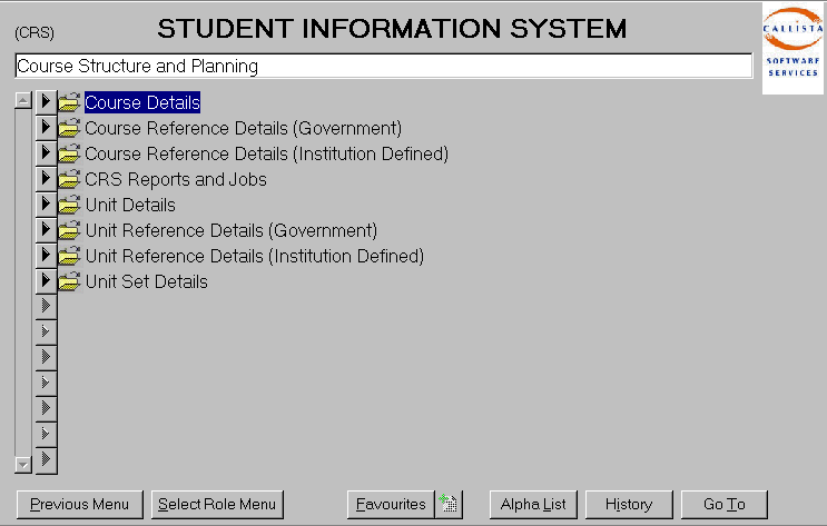 displays your Favourites menu. This is a menu which you are able to configure for quick access to your most used forms and jobs. Maintenance of your Favourites menu is described below. |