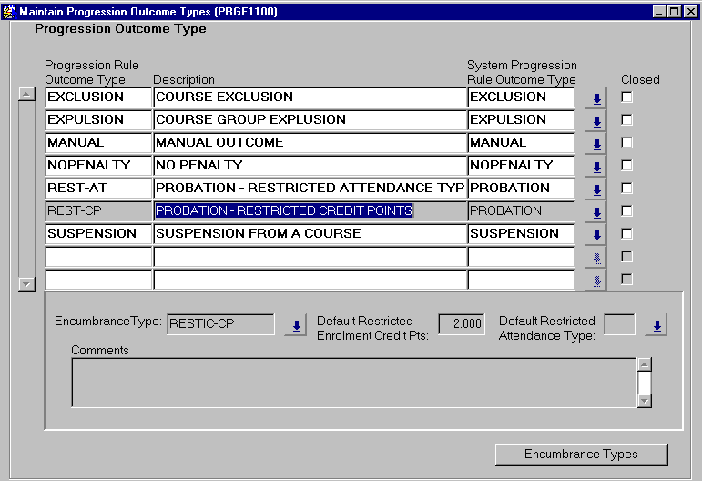 Use this form to record the Progression Outcome Types to be used within the institution. Each must be linked to a System Progression Rule Outcome Type. More than one institution-defined outcome type can be mapped to each system type. Certain System Progression Rule Outcome Types require an associated Encumbrance Type; some cannot have an associated Encumbrance Type. The system outcome types and their allowable Encumbrance Types are detailed in the table below. Explanation about the Progression Rule Outcome Type, can be recorded in the Comments text box. The Encumbrance Types button can be used to navigate to ENRF6200 to create or view encumbrance types and associated encumbrance type effects. |