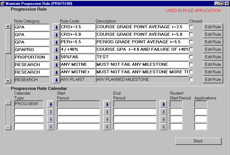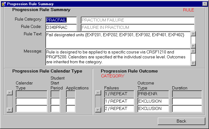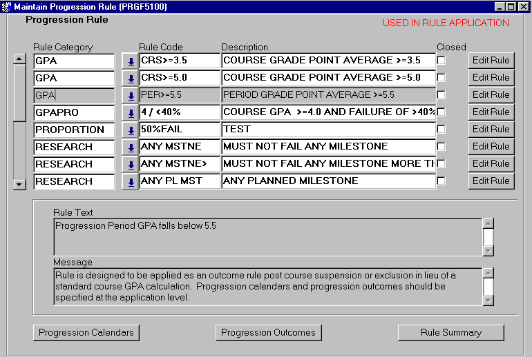 Progression rules may be general application progression rules that are used in many progression periods and at one or more levels of the institution (e.g. for more than one organisational unit). This form is used to create and maintain this pool of general application progression rules - defining and constructing the rule and assigning both progression calendars and outcomes to it. Each rule is defined by a Rule Category, Rule Code, Description and the Rule Text. When constructing the rule text (in RULF2000 accessed via the navigation button), the available rule options are determined by the Rule Category selected when defining the rule. For example if a rule is assigned an institution-defined rule category mapped to the system rule call code PRG-GPA, this means that the rule options available are those that measure progress using a student's Grade Point Average. A Progression Rule (even when it has associated calendars & outcomes) does not initiate progression checking until it is assigned to a progression application system element (Course Type; Organisational Unit; Course Version, Student Course Attempt) in form PRGF5200. The second type of progression rules is the 'application-specific' rules. These are defined only in the context of the system element to which the rule is to apply (and not available to be linked to any other system element). Rules of this type are created at the rule application level using form PRGF5200. The concepts underlying these two types of progression rules are explained in the Progression Rules Overview. |