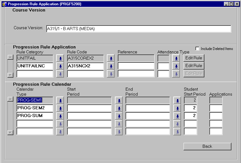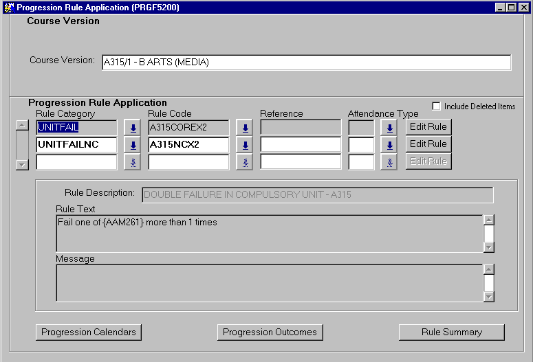 Progression Rule Application Block: This block is used to nominate the progression rules that are to be applied to all students who fit within the context 'group'. The nominated rules can be one of two types (as described above).In both cases, a Rule Category must be selected. To view all rules, including those which have been previously deleted, select the Include Deleted Items indicator and re-query. To select a general application rule :From the nominated Rule Category, select the Rule Code for the required rule. Enter an Attendance Type, if required. Where entered, the rule is applied only to students of the specified attendance type, within the context 'group'. General application rules cannot be modified in this form. This applies to the Rule Code, Rule Description and Rule Text fields. Editing these rules can only be done from PRGF5100 (or RULF2000 via PRGF5100).The Message field can be used to fully describe the context Rule Application - where it is intended to apply; the progression calendars and outcomes linked to it, the group of student to which it is to apply. |