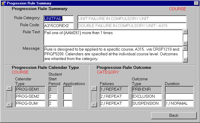 In this form, the progression rules are linked to the 'groups' (or system elements) within the institution. This linking controls the application of rules to a Student Course Attempt. The form can only be accessed in the context of the system element within which it is to be applied. The context block is dynamic and displays block and field labels and data applicable to the element from which it was entered. The context forms which allow access to this form are: