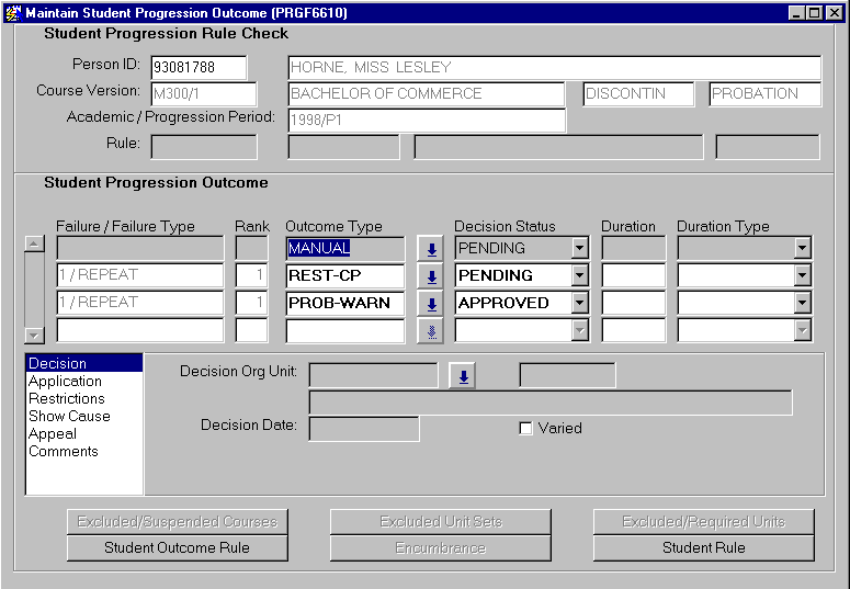Updating the Decision Status :Decisions taken about this student progression outcome by a progression review panel (or an authorised individual) are recorded by updating the Decision Status and recording the required details against the Decision T-List item. When changing the decision status to any status other than PENDING, the organisational unit responsible for this decision and the date of the change must be recorded. The Org Unit code entered (or selected from the List of Values) can be either that which owns the course or a parent organisational unit. The decision date is automatically inserted but can be backdated. The changing of the decision status may trigger a change in the progression status. A Student Course Attempt may have multiple outcomes. Where a decision is taken to approve only one, the remaining outcomes should be waived to ensure that the student's progression status correctly reflects this decision. Any remaining PENDING outcomes result in a progression status of UNDCONSID.Varied Indicator: This indicator is set by the system. This occurs when any of the values, inserted into this student progression outcome from an existing progression rule outcome (defined in PRGF5214), are modified. These changes may be made to Modifying the Duration Values: The Progression Outcome may have default duration values (entered when defining this outcome in PRGF5214). These defaults can be modified, for this specific student progression outcome. Where duration values are required, but none exist an error is triggered and the values must be recorded before the outcome can be committed. |