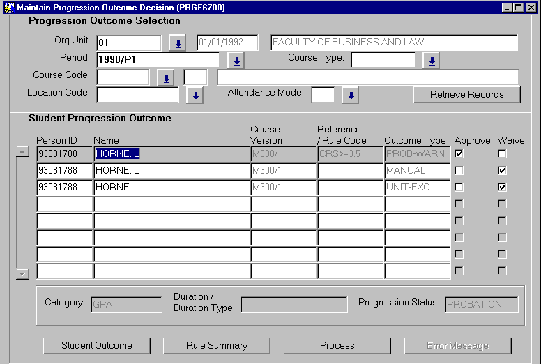 Using the Student Outcome button:This provides access to PRGF6610 - Maintain Student Progression Outcome. This form may be accessed for these purposes.
