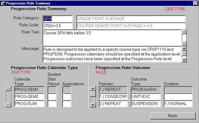 Using the Progression Rule Summary pop-up:This pop-up screen displays a summary of information relating to the context progression rule application. The Progression Rule Summary block displays the rule category and code and their descriptions. The Rule Text displays the actual rule constructed in RULF2000. The user-defined message displayed is inherited from one stored against either the rule application, rule or rule category (inherited in that order, where different messages have been stored at more than one level). A Lamp displays in the top right corner of this block indicating to which system element this rule has been linked, in creating this rule application. The four options are CRS TYPE, COURSE, ORG UNIT or STUDENT.The lower blocks display summary information for all calendar types and outcomes currently assigned to this rule application. A lamp displays in each of these blocks to indicate from where the calendars and outcomes have been inherited. This will be one of six options — RULE, CATEGORY or one of the four rule application system elements (as in the first block). |