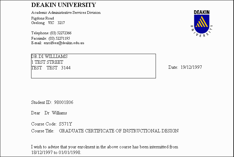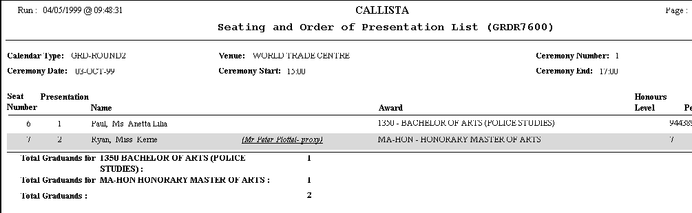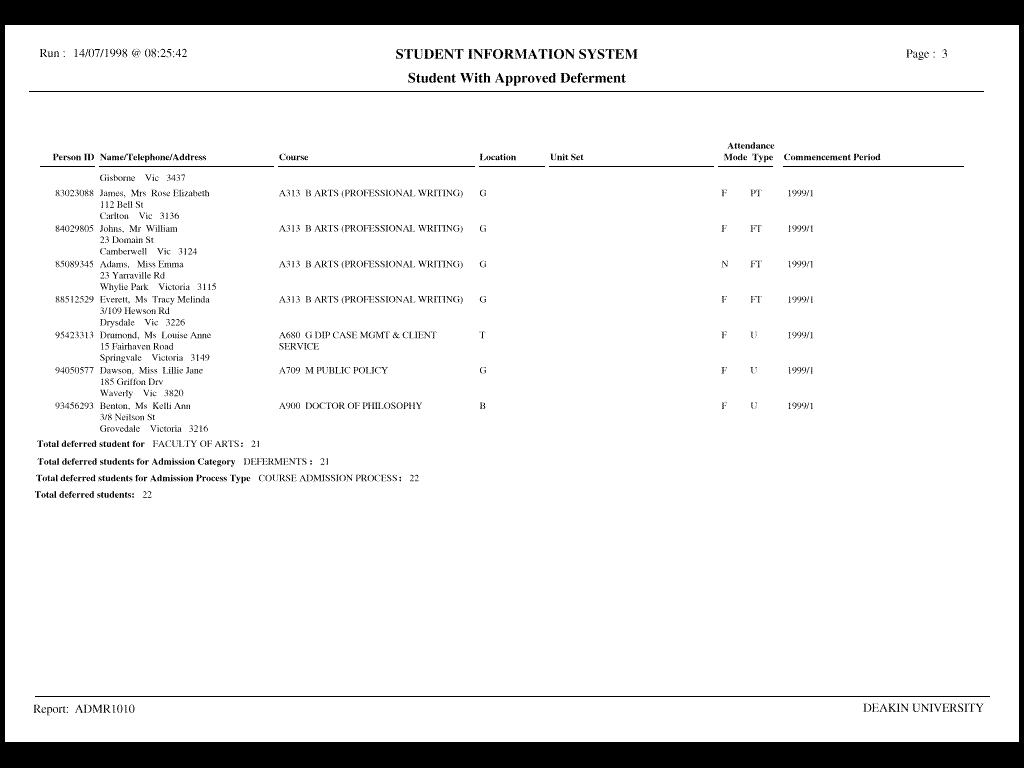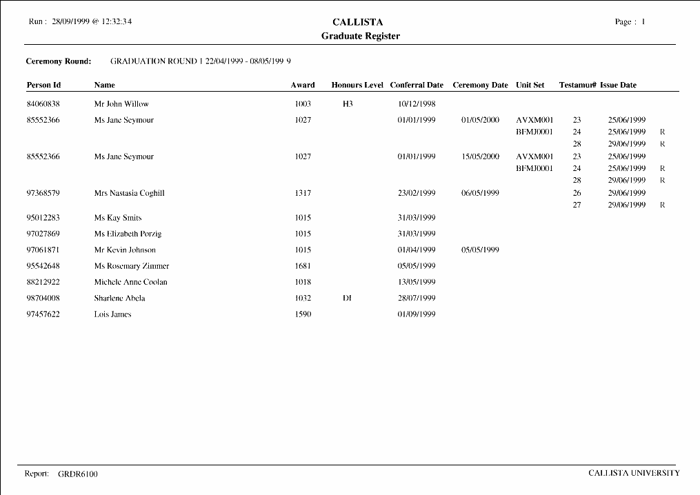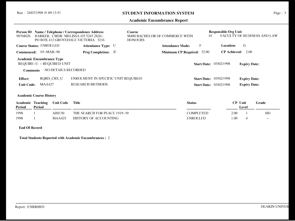 A comprehensive listing of the courses, advanced standing granted and units of study undertaken by a student. The academic history also reports details of any current academic encumbrances. A broad set of parameters allow the report to be run for nominated individuals or specified groups of students. |