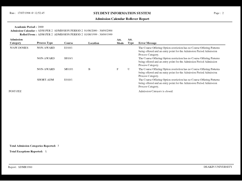 This report displays exceptions from the Admission Calendar Rollover process that were not able to be rolled over. |