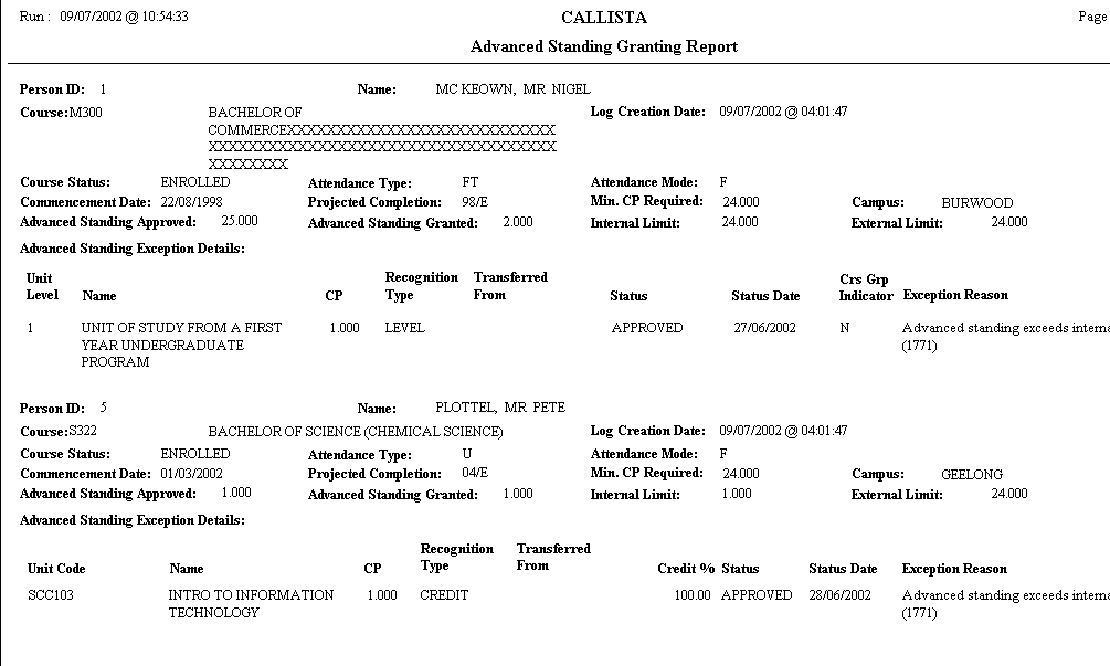 A report of advanced standing, either granted or unable to be granted, run against a log table or log tables from a specified date. It may include all records or only exceptions (i.e. advanced standing which could not be granted). It can be run for selected combinations of course code/course status/person ID(s). |