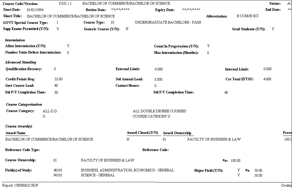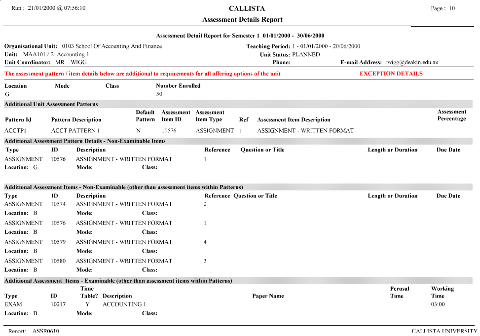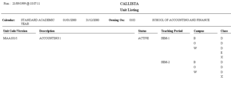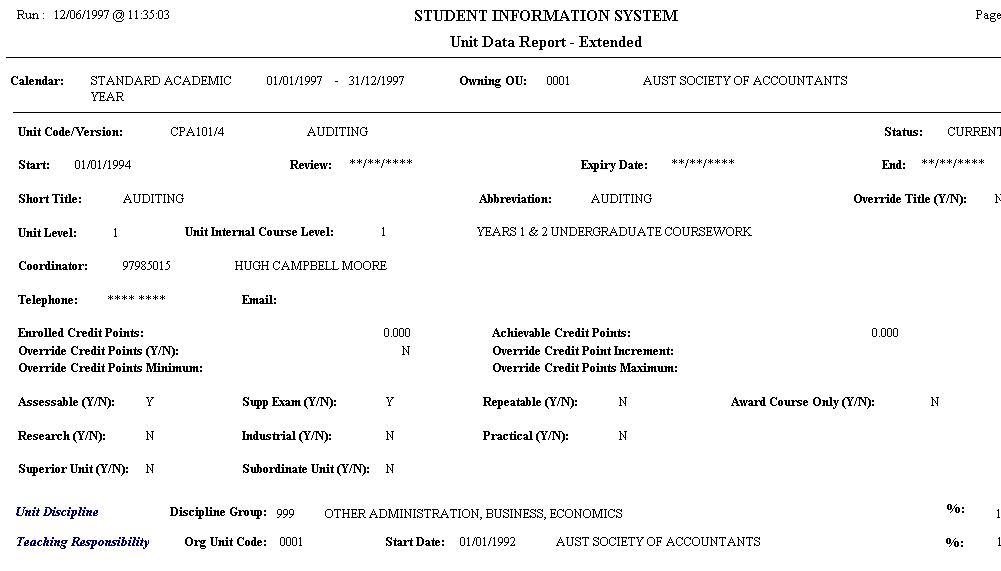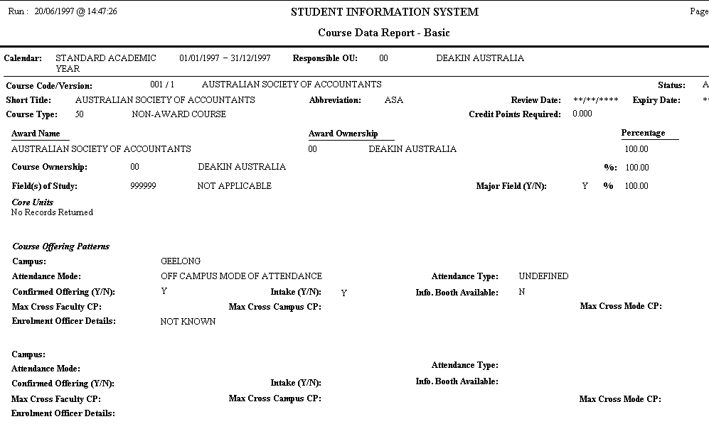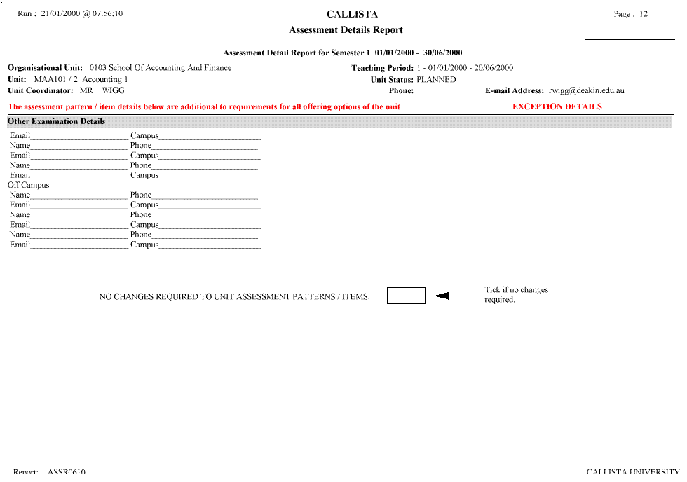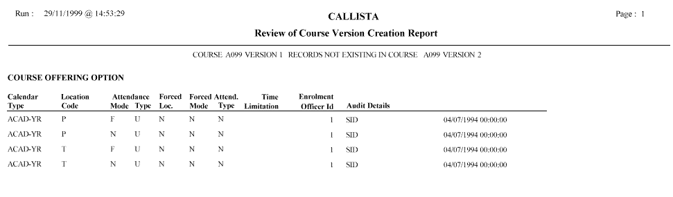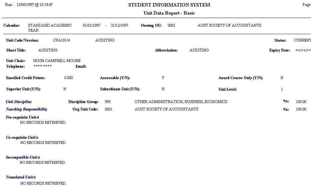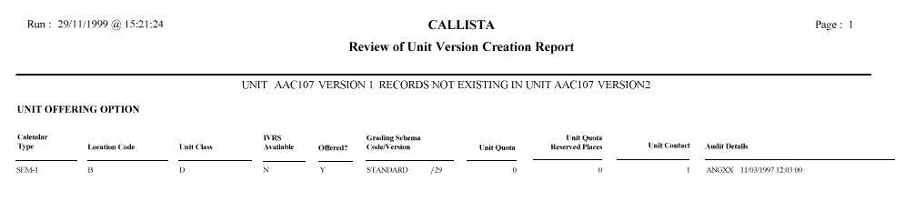 A listing of unit version details not copied to a new unit version from an old unit version. This report is auto-generated when a new unit version is created from an existing unit version if the system is not able to copy all details from the old to new version. (eg. a discipline may have been closed and therefore cannot be linked to the new version). The report may also be run manually by inserting the old and new unit version details in the user parameters fields. |