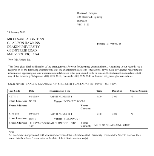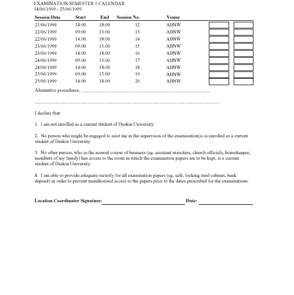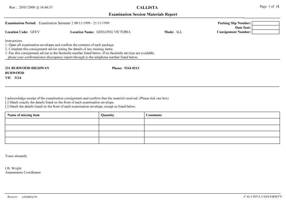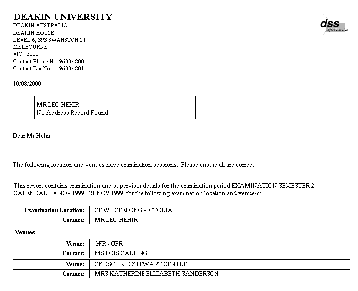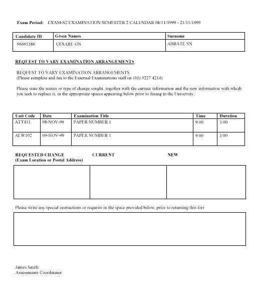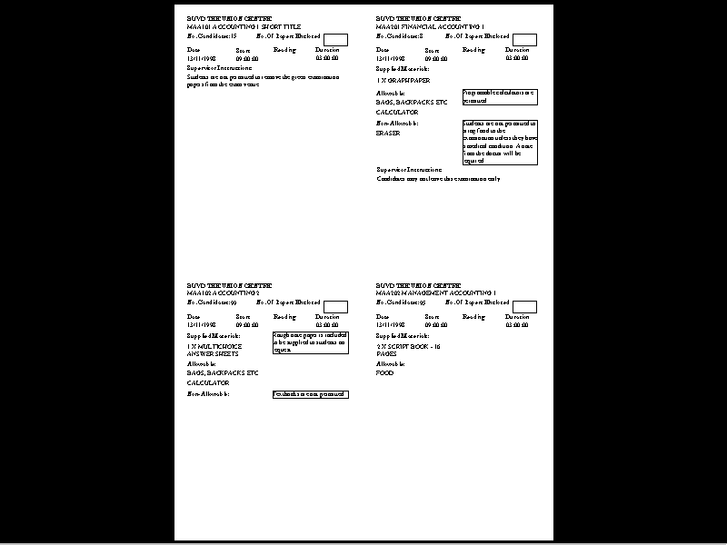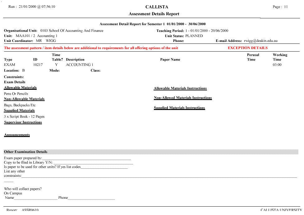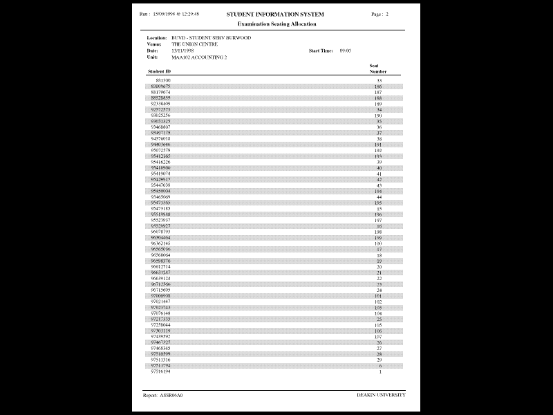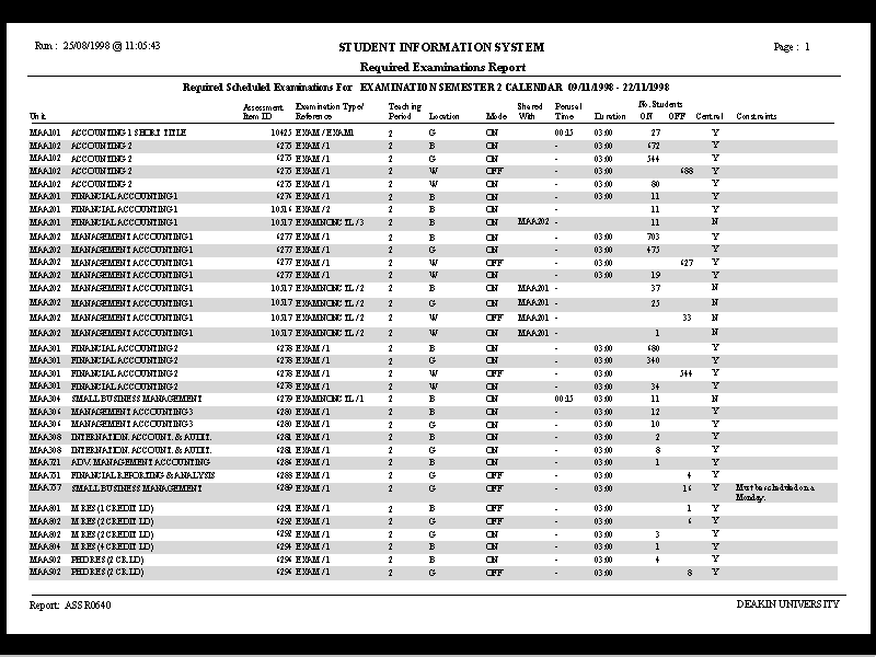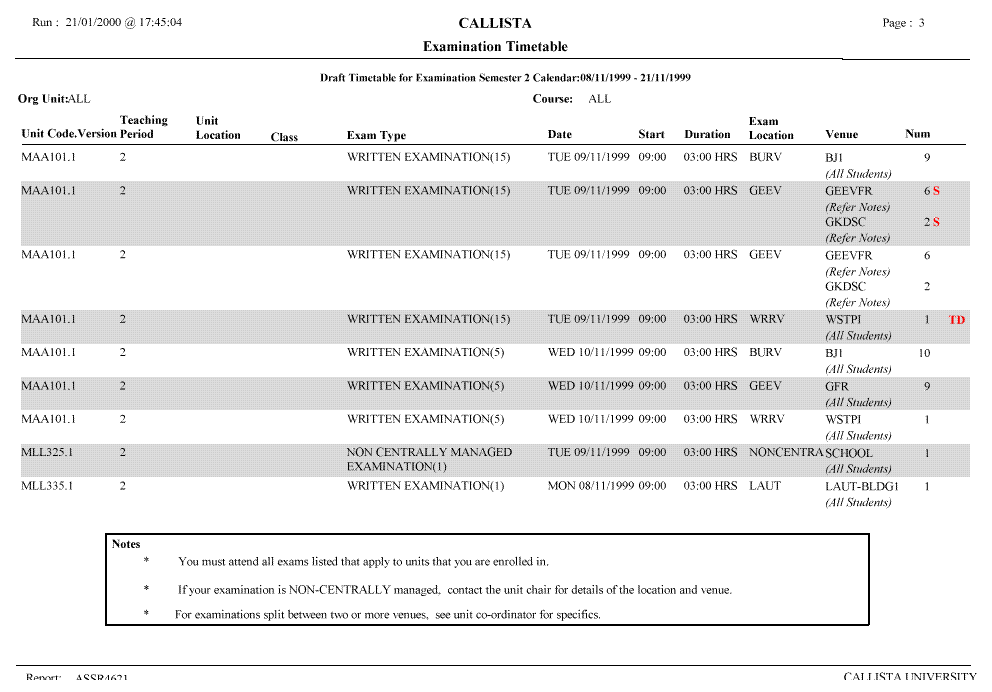 This report produces printed copies of the examination timetable in order to advise students and supervisors of examination details. |