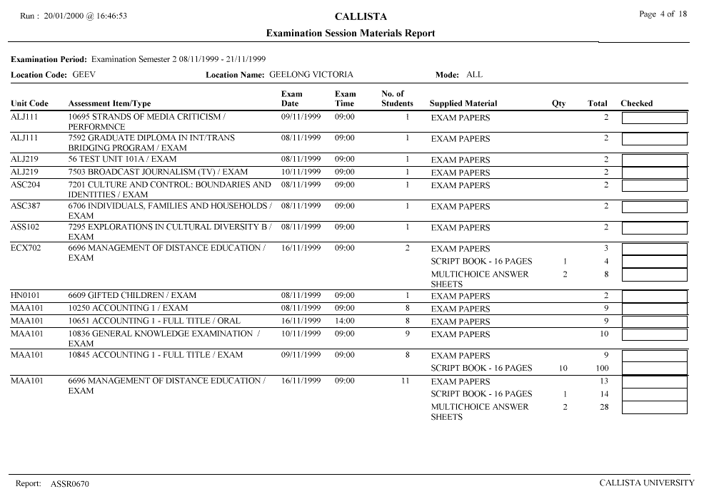 This report displays examination session details by location then unit and then date. It includes information on the number of students and accompanying supplied examination materials for all student examinations to be undertaken during a specified examination period. |