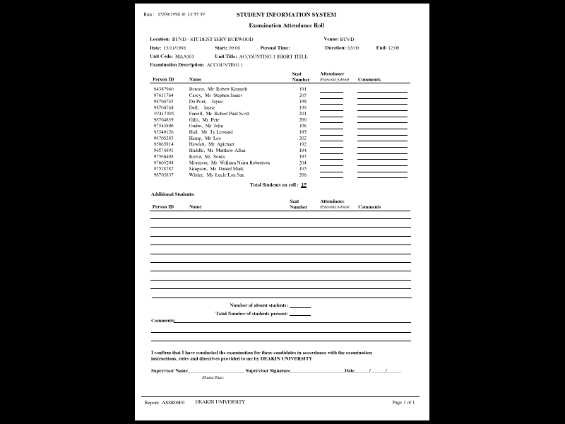 This report produces a list of students who are expected to attend an examination at a particular venue and session. |