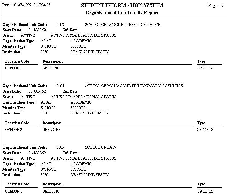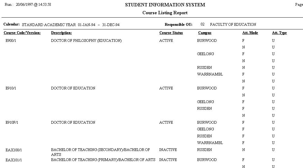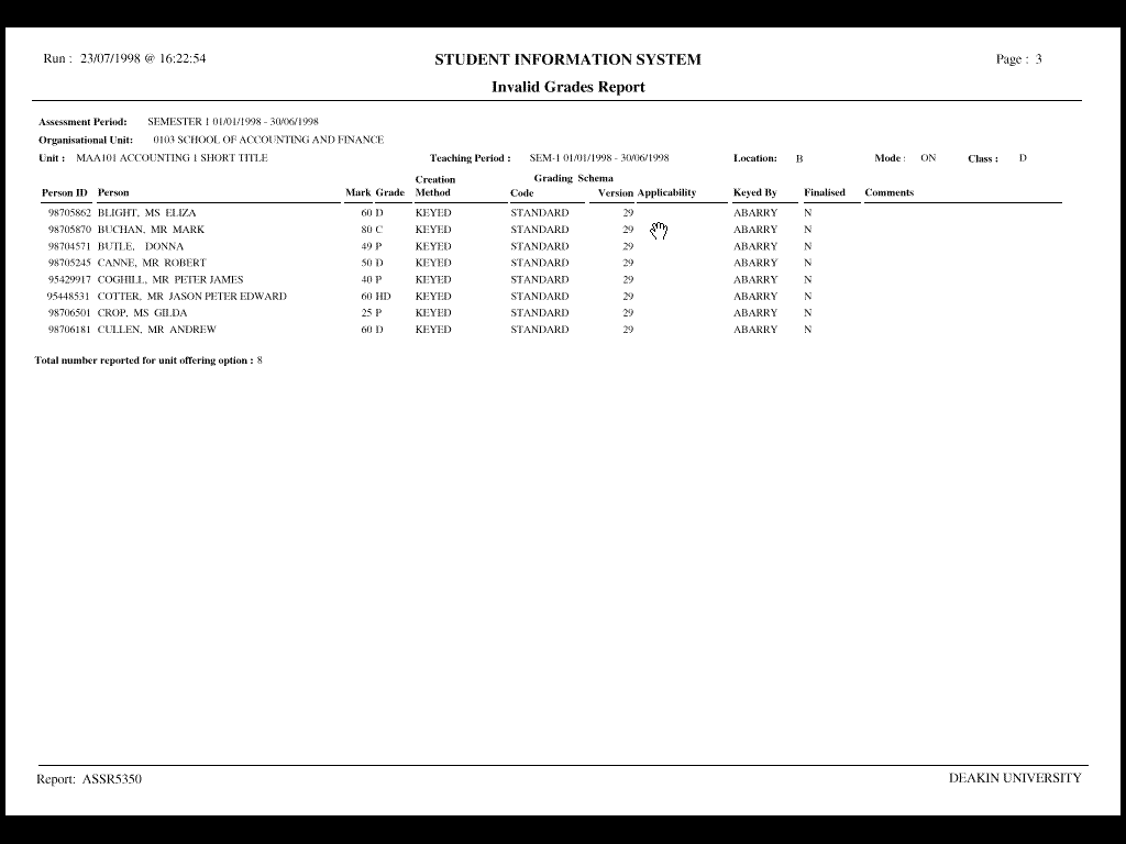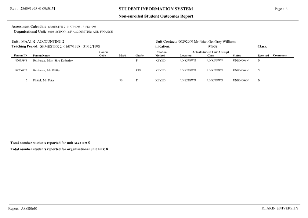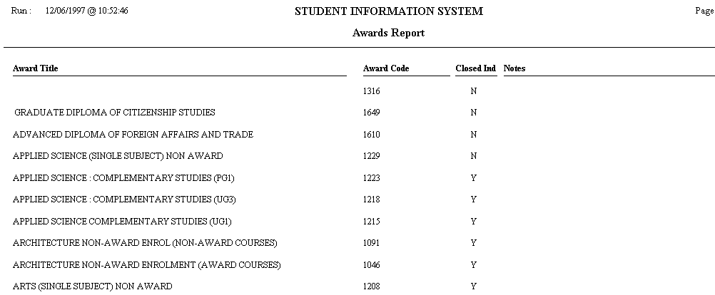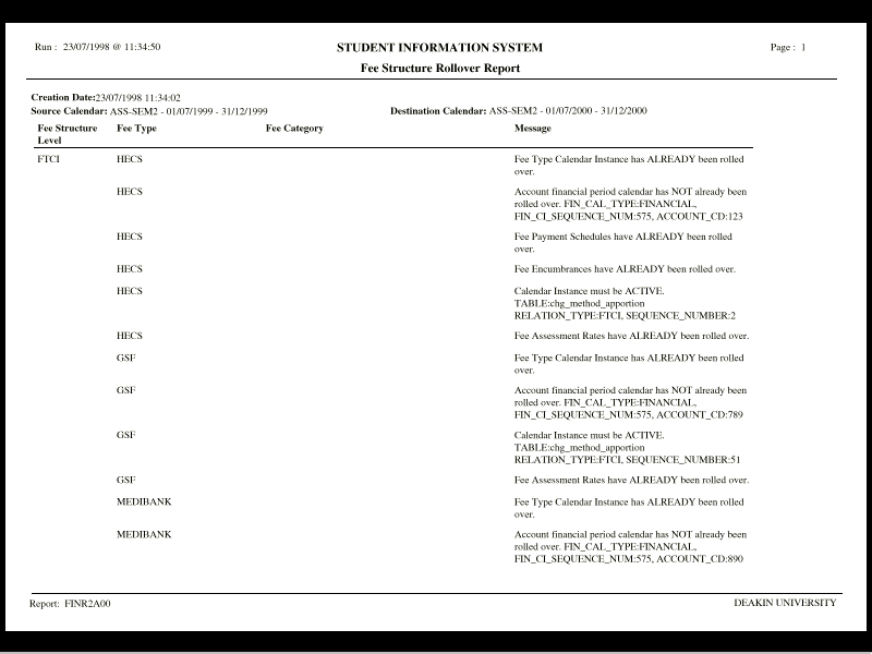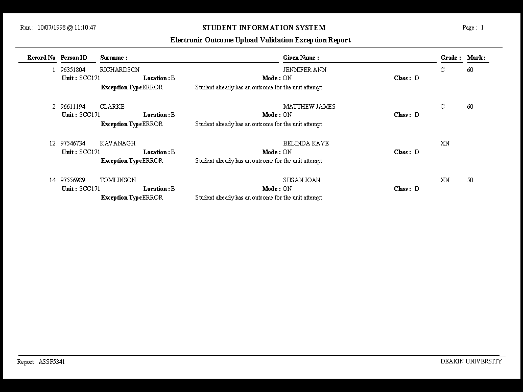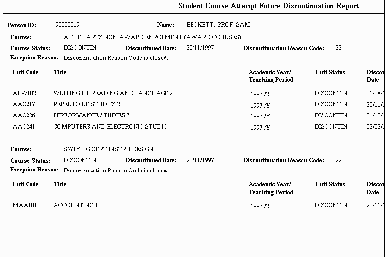 A report of discontinuations processed through a batch process. If a future date has been entered for the discontinuation, the batch process attempts to effect the discontinuation when the date is reached. It may include all records or only exceptions (i.e. discontinuations which could not be effected). A set of selection parameters allow the report to be run for nominated units or groups of units within a particular teaching period. |