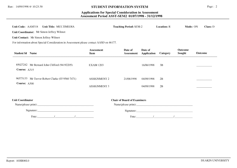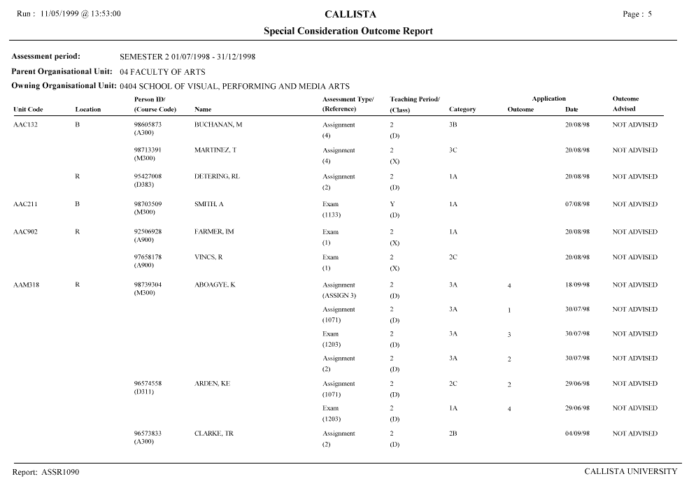 This report produces correspondence to students informing them of the outcomes of their application for special consideration for each unit assessment item. |