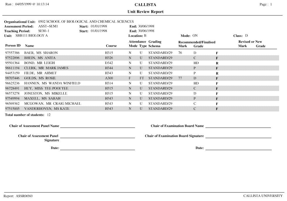 This report produces student unit attempt outcomes in a form that can be used for display on noticeboards. |