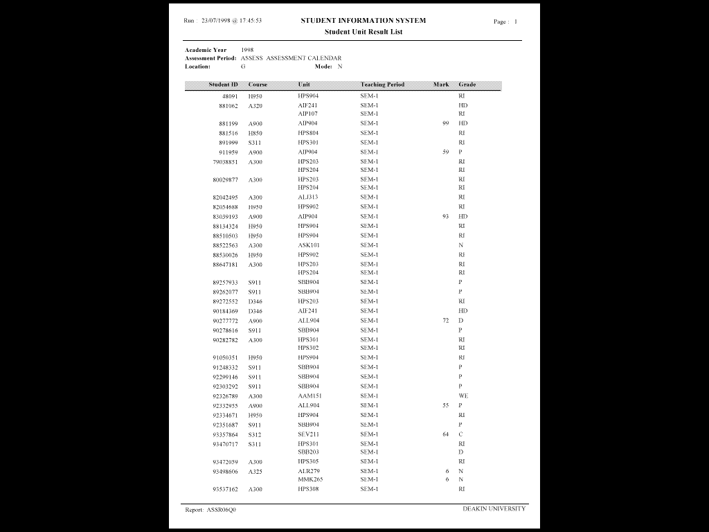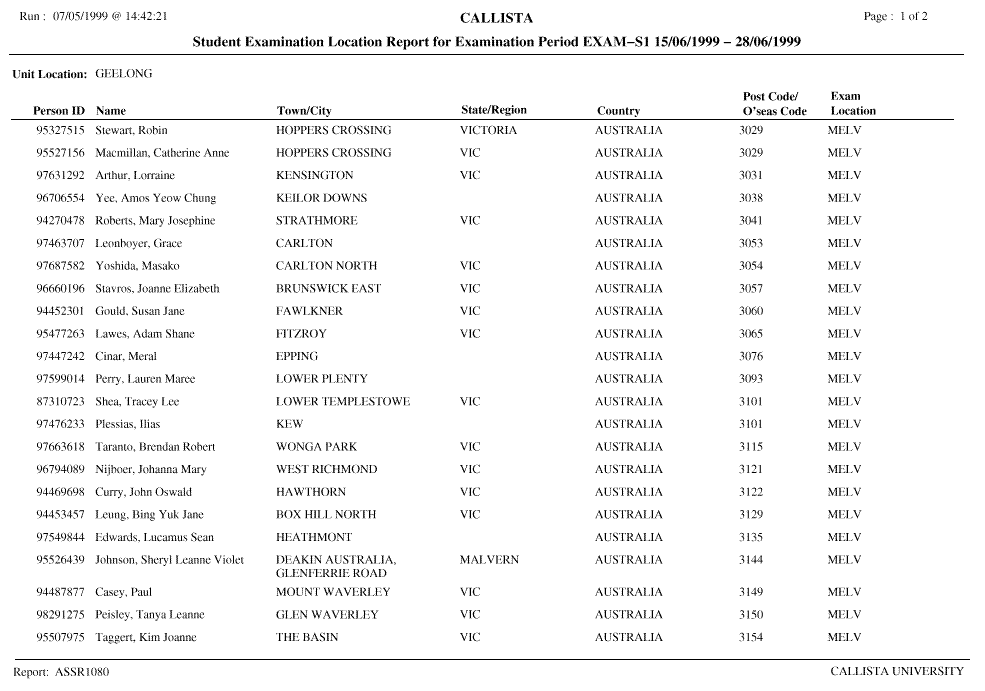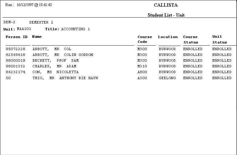 A listing of students enrolled (or other specified unit attempt status) in a given unit offering or set of unit offerings. A set of selection parameters allow the report to be run for nominated units or groups of units within a particular teaching period. |