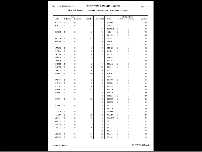 This report produces a list of all units with examinations scheduled in the nominated assessment period, and lists against them every other unit which has co-enrolled students. |