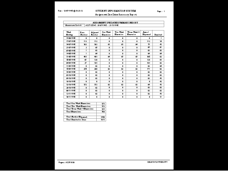 This report summarises the assignments due for pre-determined calendar weeks and is used primarily to plan resource allocation for assignment tracking and receipt. |