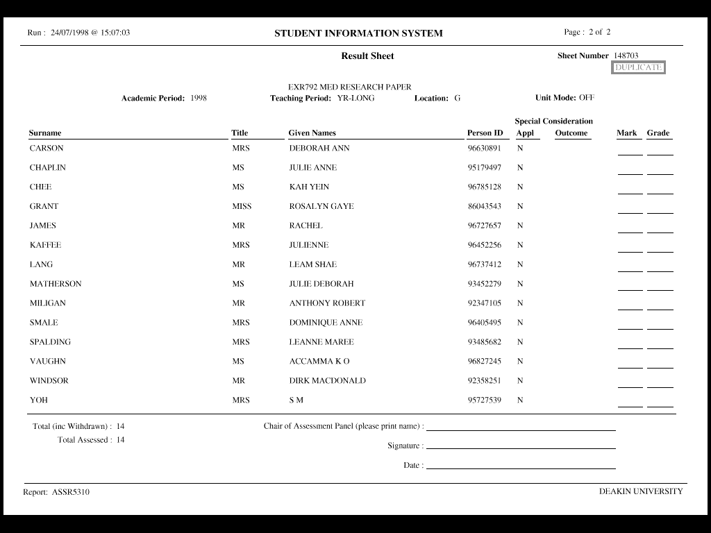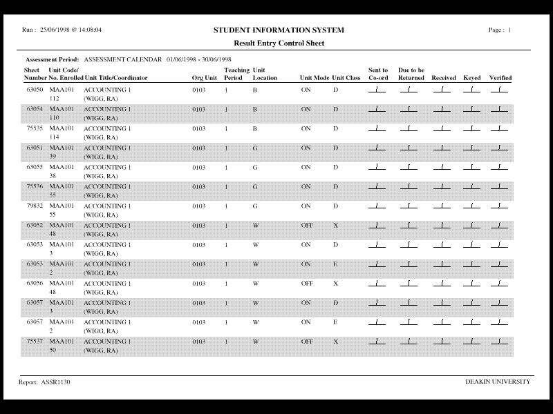 This report produces pro-forma result sheets that are used by academics for recording student unit attempt outcomes. These result sheets are then used for manual keying of results. |