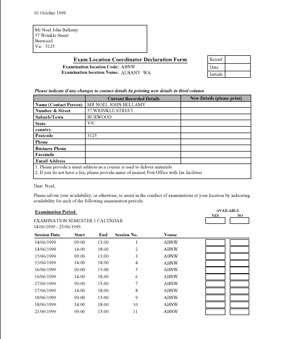 Produces letters that are sent to examination venue coordinators to determine the availability of examination location venues. |