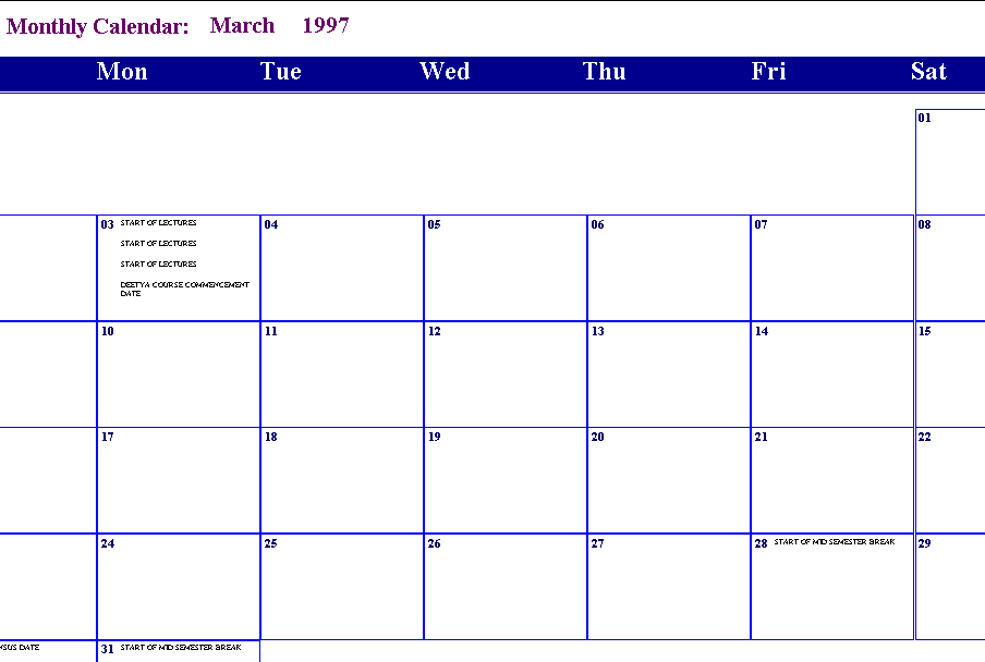 A traditional wall calendar format displaying date alias instance details in each day block for the selected month/year. |