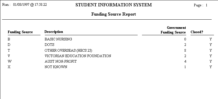 Alpha listing (by funding source) of all institution-defined funding sources for selected closed indicator value/s. |