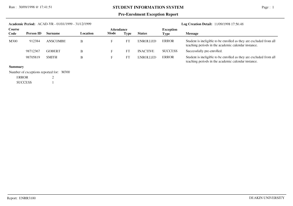 This report displays any exceptions encountered during the Batch Pre-Enrolment process (ENRJ3100). |