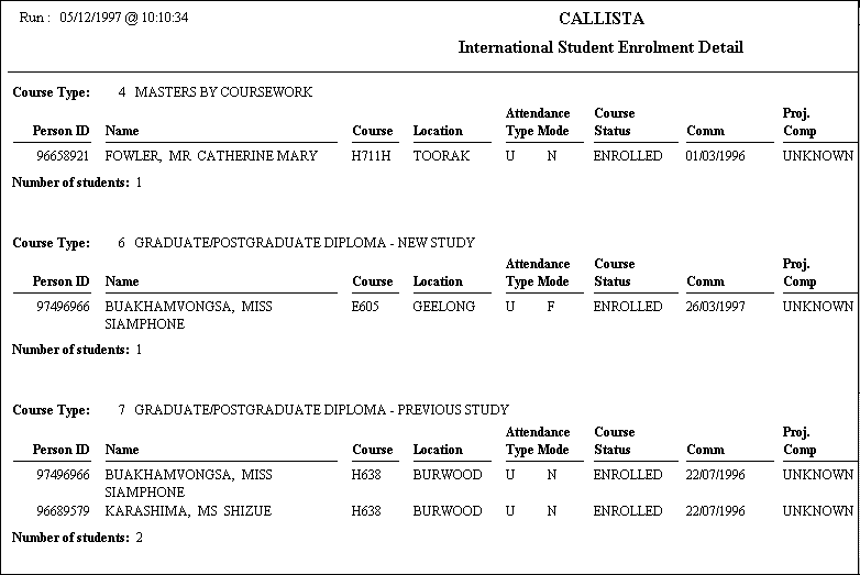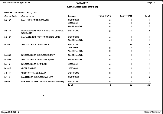 A summary report listing the number of students enrolled in a given course offering option or set of course offering options. Student data is summarised by course location and attendance type. The set of selection parameters allow the report to be run for all students in the nominated course(s) or particular subsets of students. |