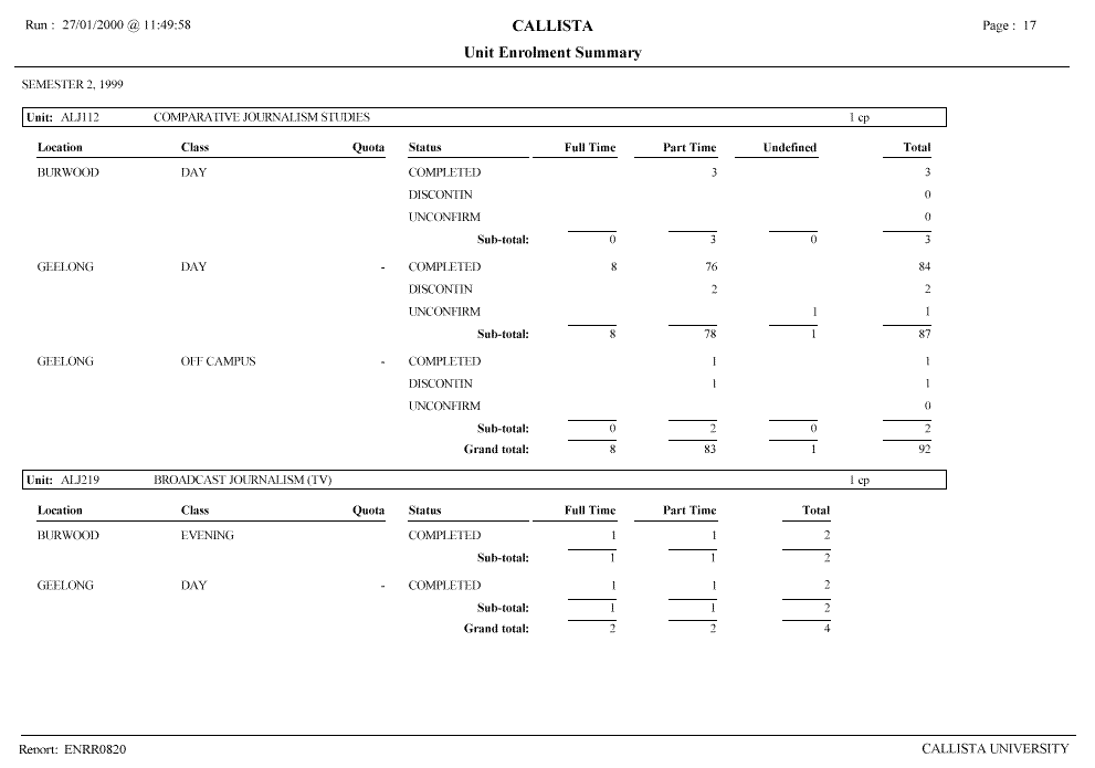 A summary report listing the number of students enrolled (or other specified unit attempt status) in a given unit offering or set of unit offerings. Student data is summarised by attendance type. The set of selection parameters allow the report to be run for all students in the nominated unit(s) or particular subsets of students. |