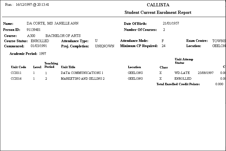 A report detailing a student's course and unit enrolment in the nominated academic calendar. The set of parameters allows the report to be run for specified individuals or for nominated groups of students. |
