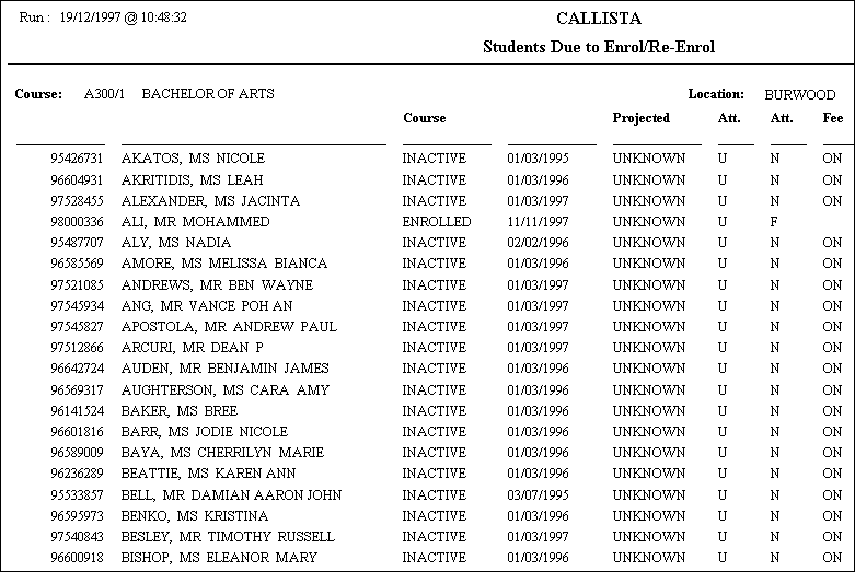 A report listing students eligible to enrol or re-enrol within a specified Enrolment Period. The set of parameters allows the report to be run for all eligible students, new students only, or returning students only. These parameters can be further refined to identify more specific groups of students eligible to enrol or re-enrol. |