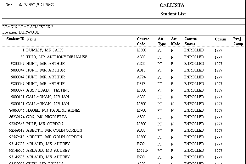 A report containing name and brief course details of enrolled (or other nominated course status) students. The set of parameters allows the report to be run for the whole institution, for one or more locations, or for one or more organisational units. Additional parameters allow the set of selected students to be further refined. |