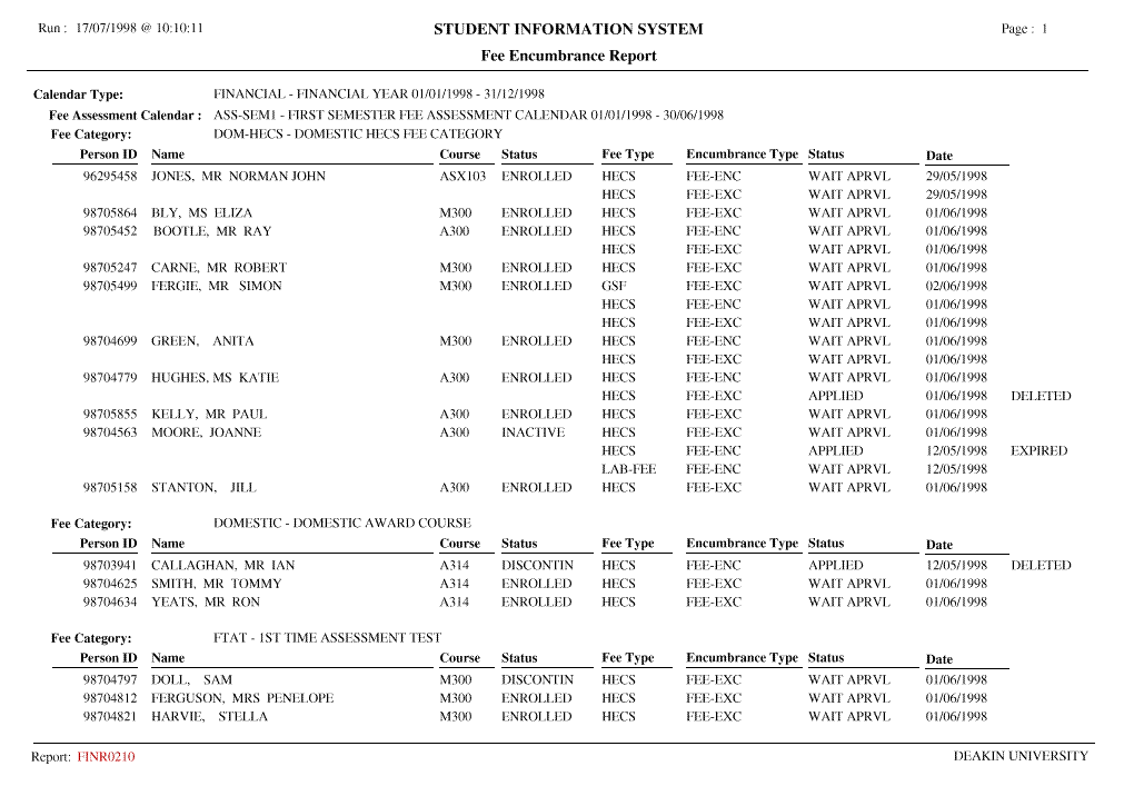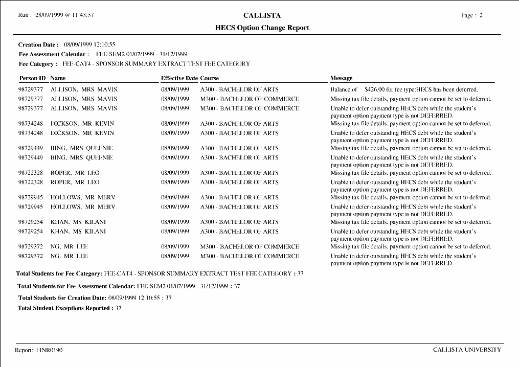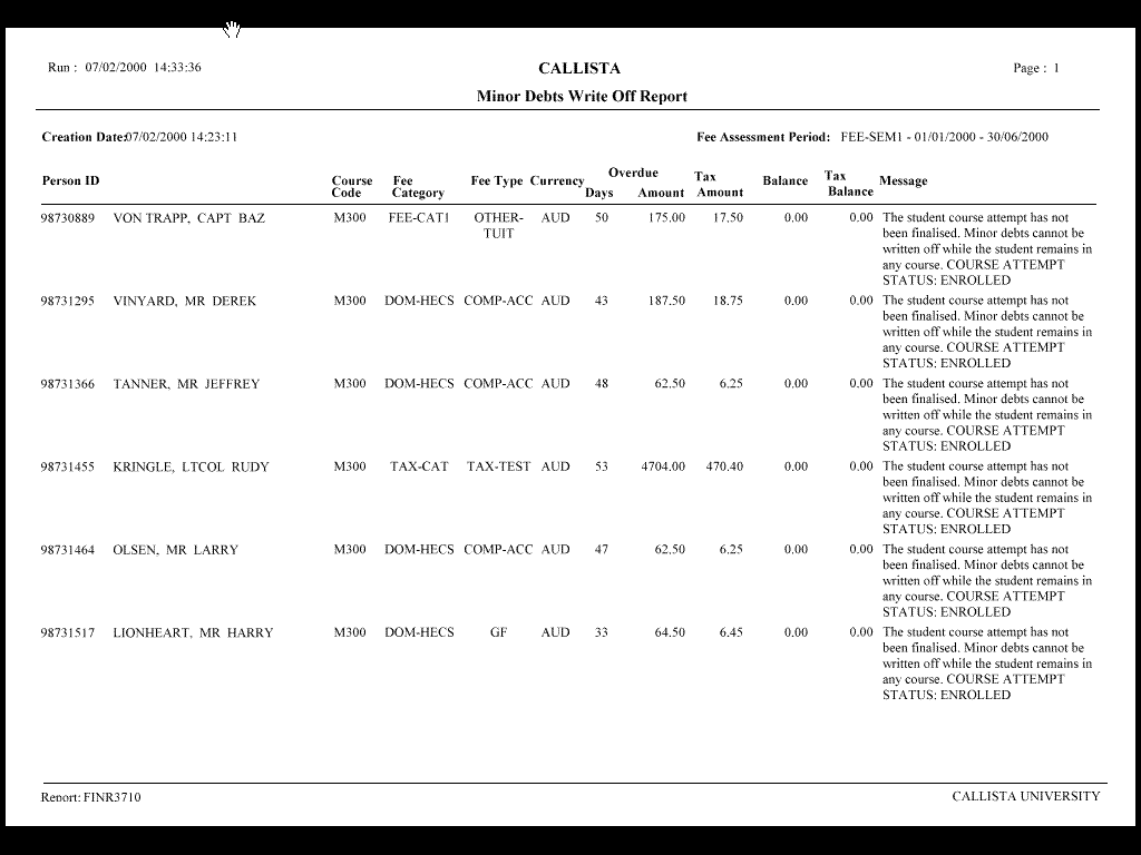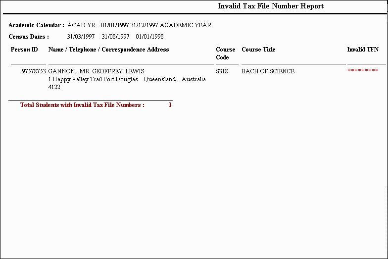 A list of students enrolled in a selected academic period, whose tax file number has an invalid date. It can be run for selected combinations of enrolment category/responsible org. unit/location/course type/course code/commencement type/attendance mode. |