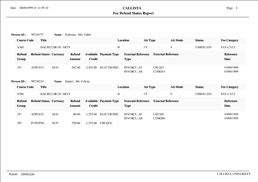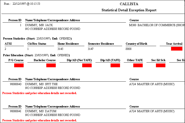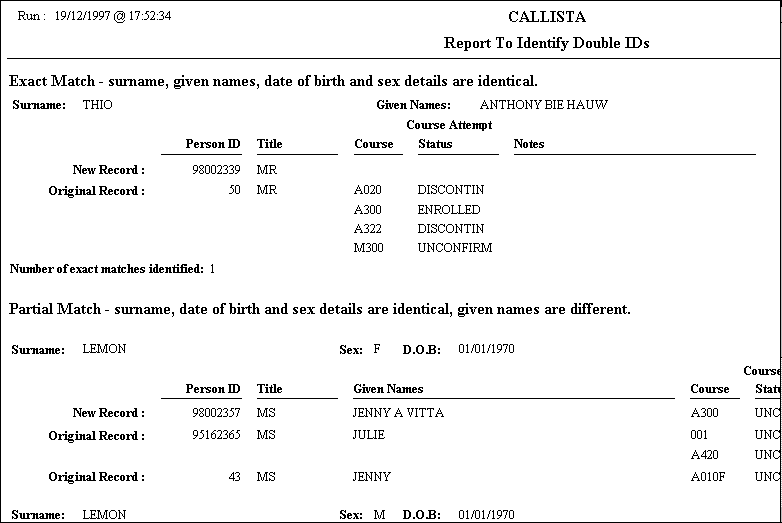 This report should be run immediately after any process which creates a set of new Person ID's such as the VTAC load of new students. Callista defaults the 'Last Person ID' This ensures that each time the report is run the system checks all new IDs against all other records in the database. The default 'Last Person ID' can be changed if for any reason it is necessary to broaden or narrow the scope of the report. The report identifies three types of records: Exact Matches - where the surname, given names, date of birth and sex details of a new person record are identical to those of an existing record. Partial Match - where the surname, date of birth and sex details of a new person record are the same as those of an existing record, but given names are different Partial Match - where the given names, date of birth and sex details of a new person record are the same as those of an existing record, but the surname is different. It is recommended that any output of the report be further investigated prior to making any decision to merge Person IDs. |
