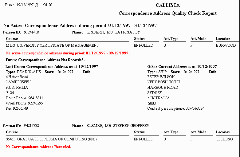 A list of students without an active correspondence address on a specified date or at any time during a specified period. The report will typically be run prior to generating bulk correspondence items. |