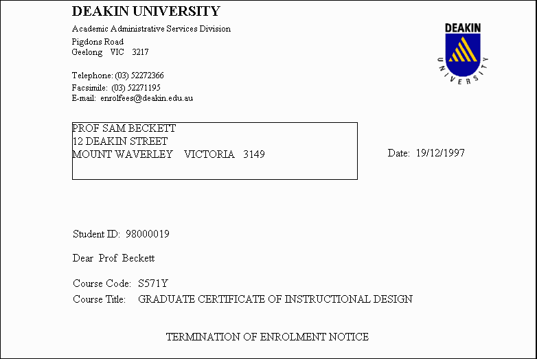 A report which produces letters to notify students of a change to their course attempt status. It may be run for the student course attempt statuses of INTERMIT, DISCONTIN, and LAPSED. Provision exists to exclude students whose discontinuation was the result of termination (an 'involuntary' discontinuation) from receiving the discontinuation letter. It can be run for selected combinations of person ID/location/course responsible org. unit. |