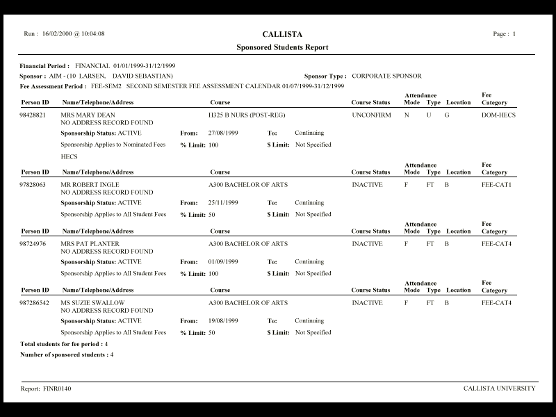 Gives personal, course attempt and sponsorship details for students sponsored during a particular academic period |