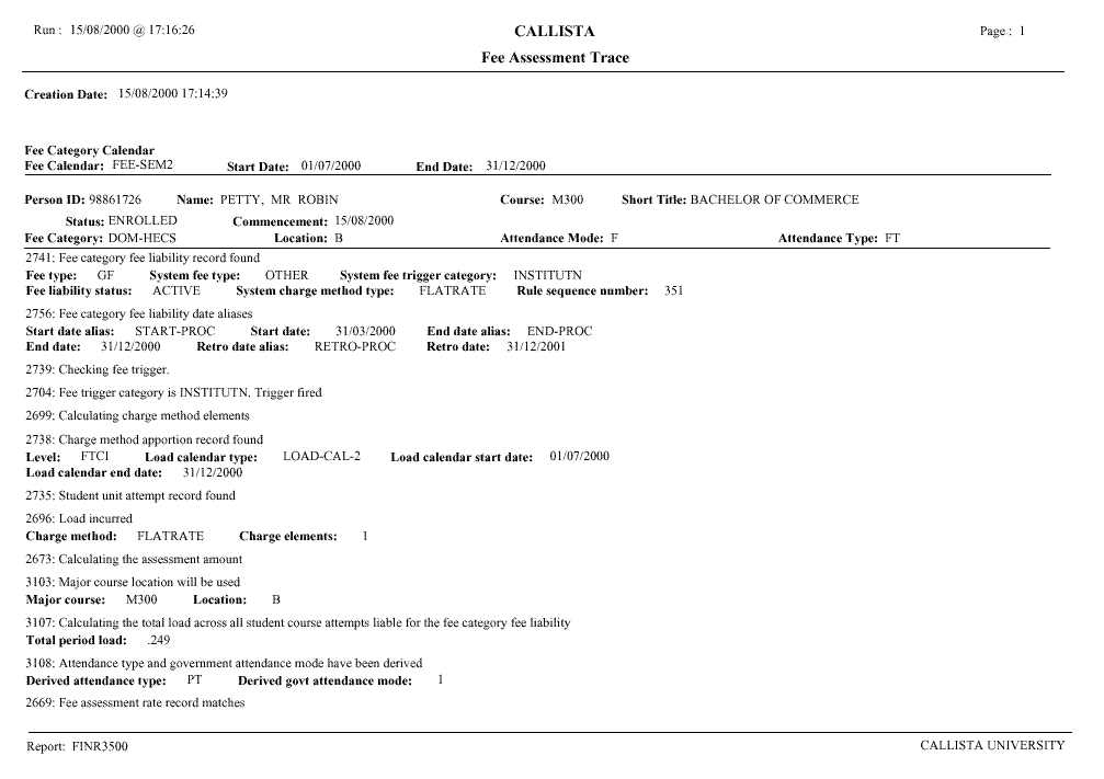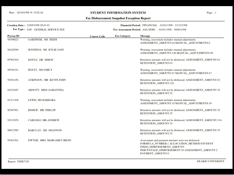 Reports on assessment or reassessment of fees due from students for a particular fee period. Assessment is the central process of the FIN subsystem. |