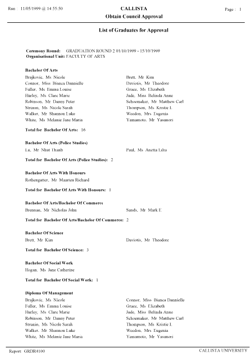 Lists graduands who are eligible to graduate, for approval by the University Council. |