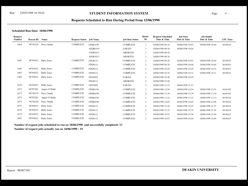 A report listing details of requests scheduled to run within a nominated period. Details are grouped within scheduled run date. Selection parameters include request status, job run status and system user (person). |
