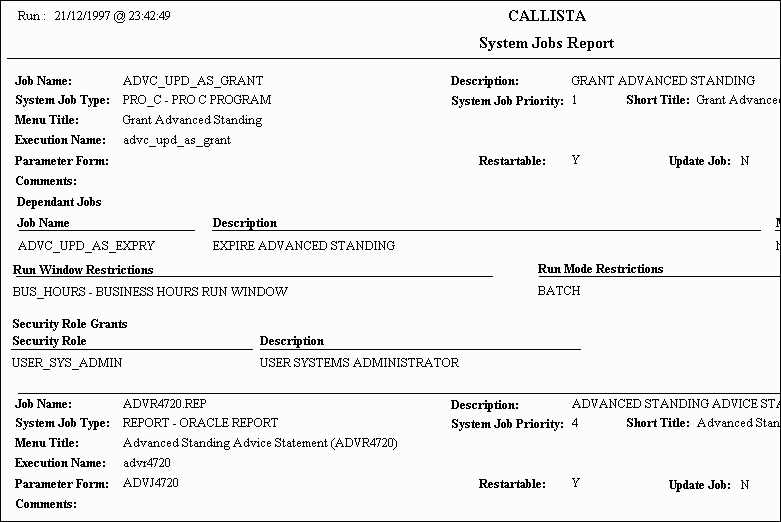 A list of registered system jobs and associated details. Jobs that are open are available for use in the Job Scheduler facility. The list can be requested in combinations of parameters including job name, job type, run window, run mode and last run date. |