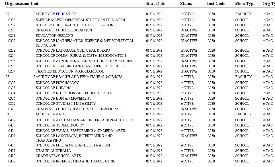 A list of all organisational unit details (excluding relationships) for selected combination of member type/organisation type/organisational units/statuses/institutions |