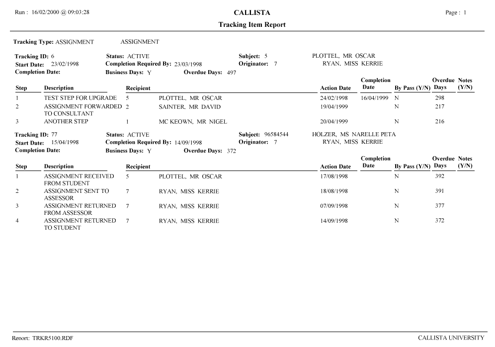 A listing of tracking items of a particular type or types. May be run for a specific originator or other combinations of parameters. Details include tracking item steps and associated action and completion dates, overdue information and tracking groups. |