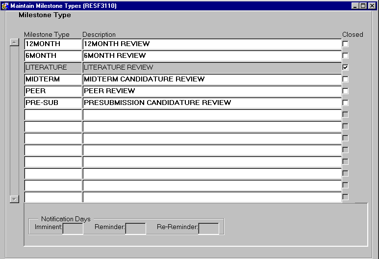 Use this form to record the institution's set of Milestone Types. Select the Closed indicator to prevent future use of a Milestone Type. Enter values for each type of Notification Day. Enter a number as follows: